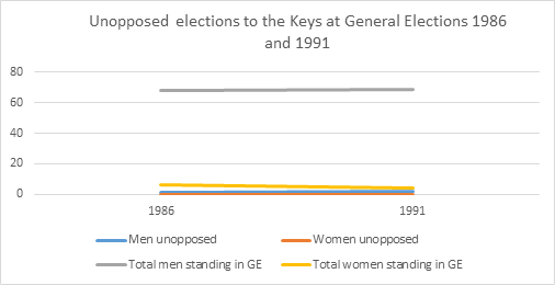 Up until the end of the 1981 General Election, only one seat in the Keys had been filled by a woman unopposed. Over the same period, 16 seats in the Keys had been filled by a man unopposed. Given 552 men stood for the Keys in General Elections during this period, as opposed to 36 women – that is, 15.3 times as many men than women – that Mrs Marion Shimmin was elected unopposed is not in itself unusual.