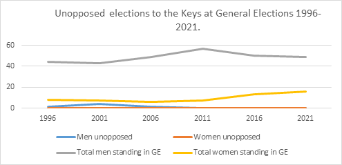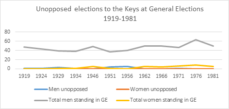 Additionally, it is worth noting a feature across the periods since 1919. The decline in the number of seats taken unopposed has occurred alongside an increase in the proportion of candidates who are women. In particular, the three General Elections from 2011 – which had no unopposed candidates – were contested by 36 women: the same number as the twelve General Elections from 1919-1981. At periods when unopposed elections were less uncommon, women candidates for the Keys were more uncommon: so it is unsurprising that only one woman was elected unopposed at a Manx General Election.